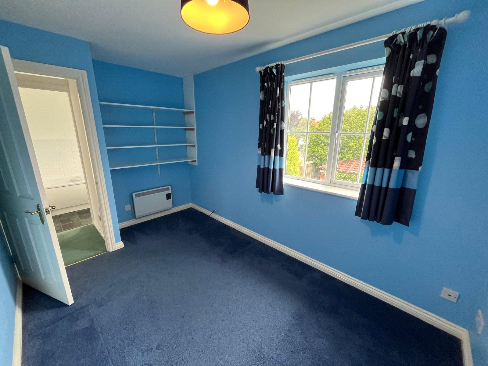 Double glazed Georgian bar window, night storage heater, TV aerial point, shelving unit, carpet.