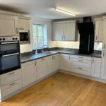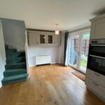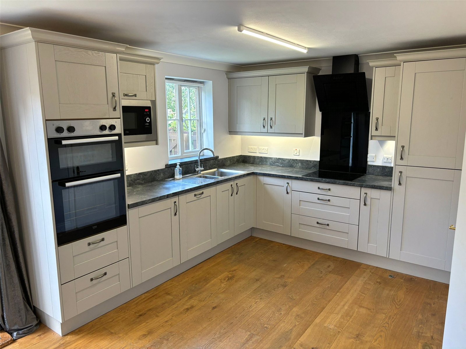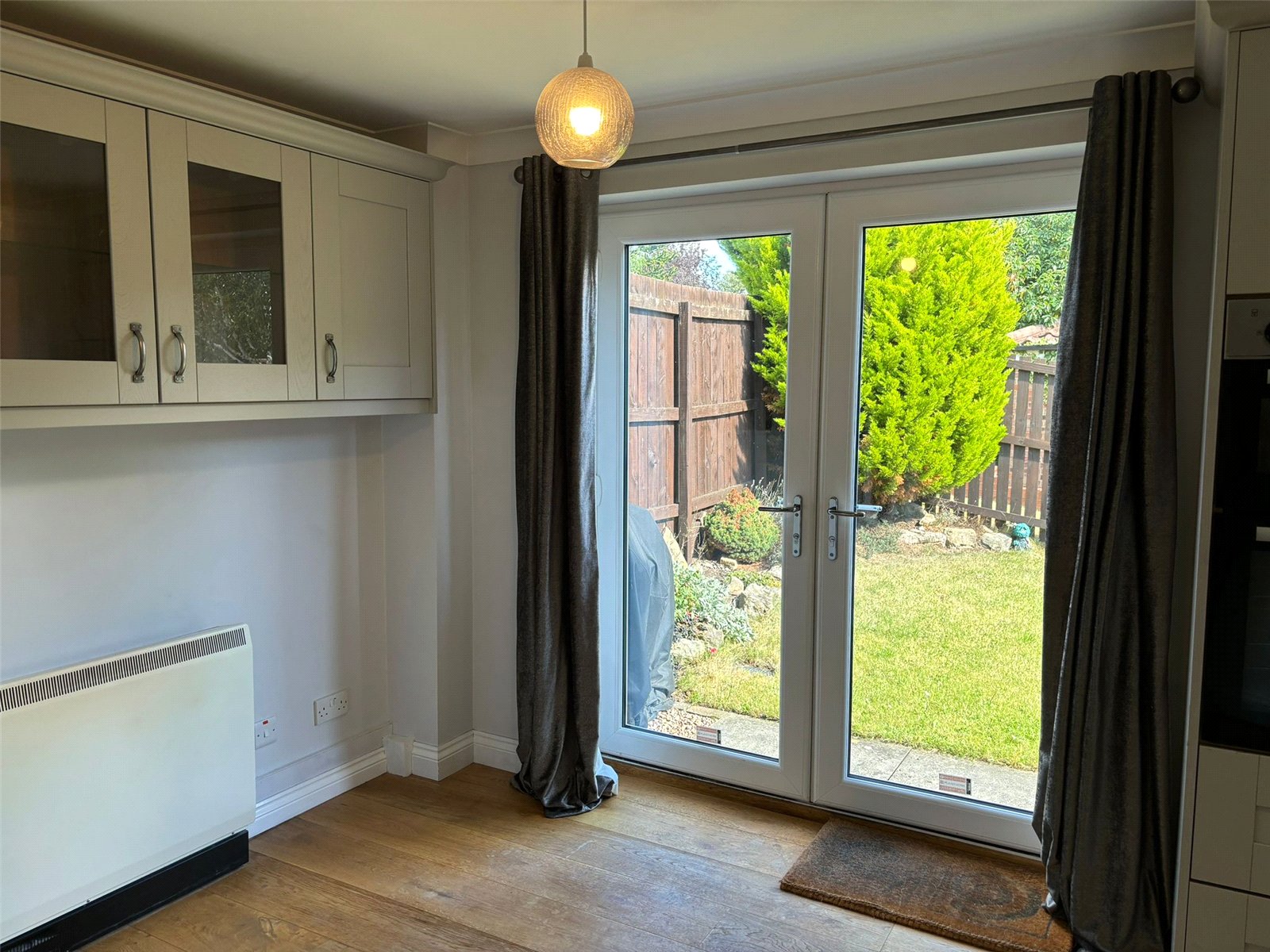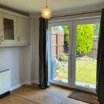 Double glazed Georgian bar window, French doors out to rear garden, full range of modern light grey wall and base units. Worktops with matching upstands. Integrated double oven and grill, electric hob, extractor, Frost-free fridge/freezer, dishwasher, microwave and one and half bowl stainless steel sink. Solid wood flooring. Night storage heater in diner.