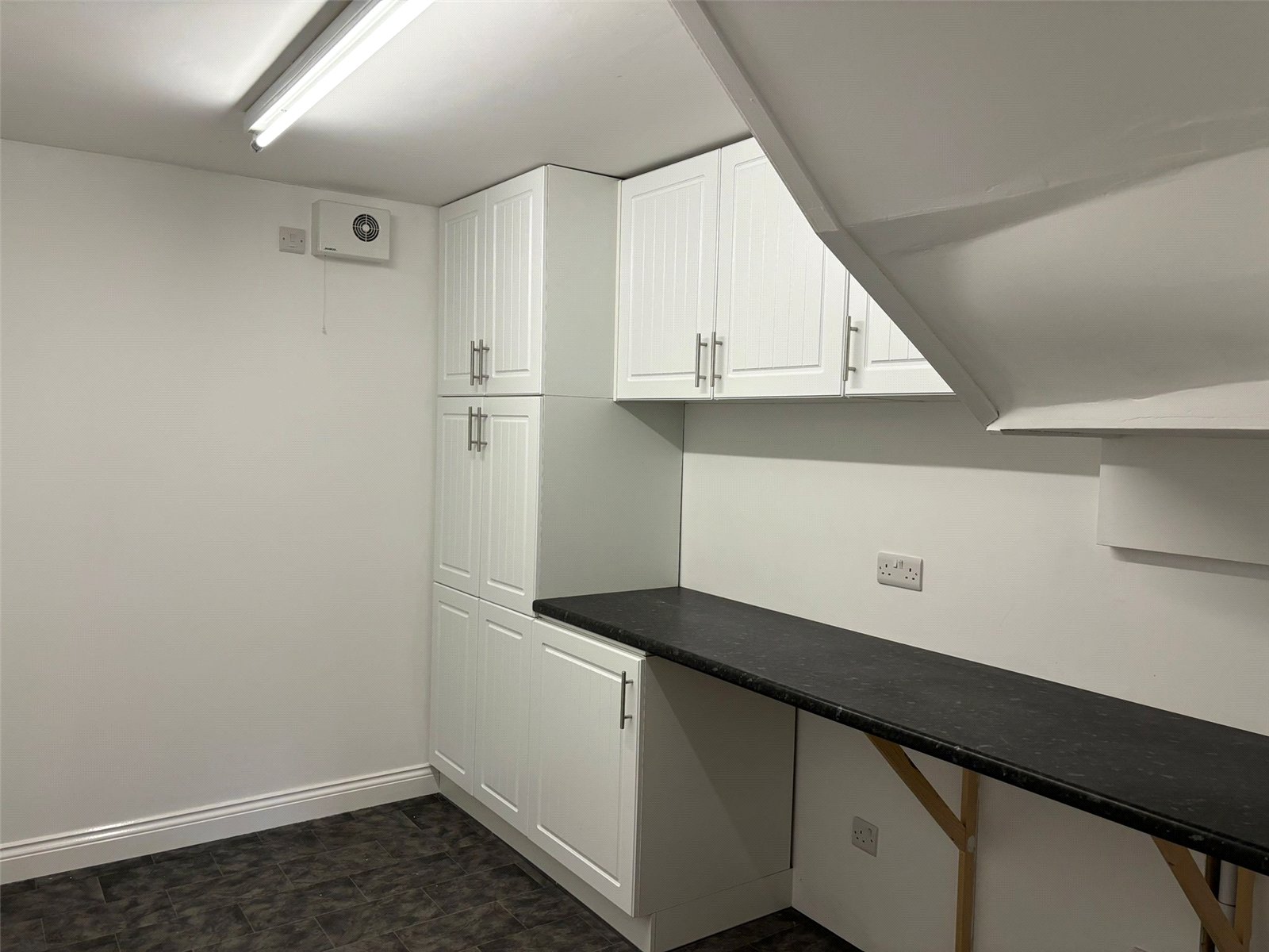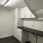 Full range of wall and base units including tall larder units, vinyl flooring and plumbed for washing machine/tumble dryer.