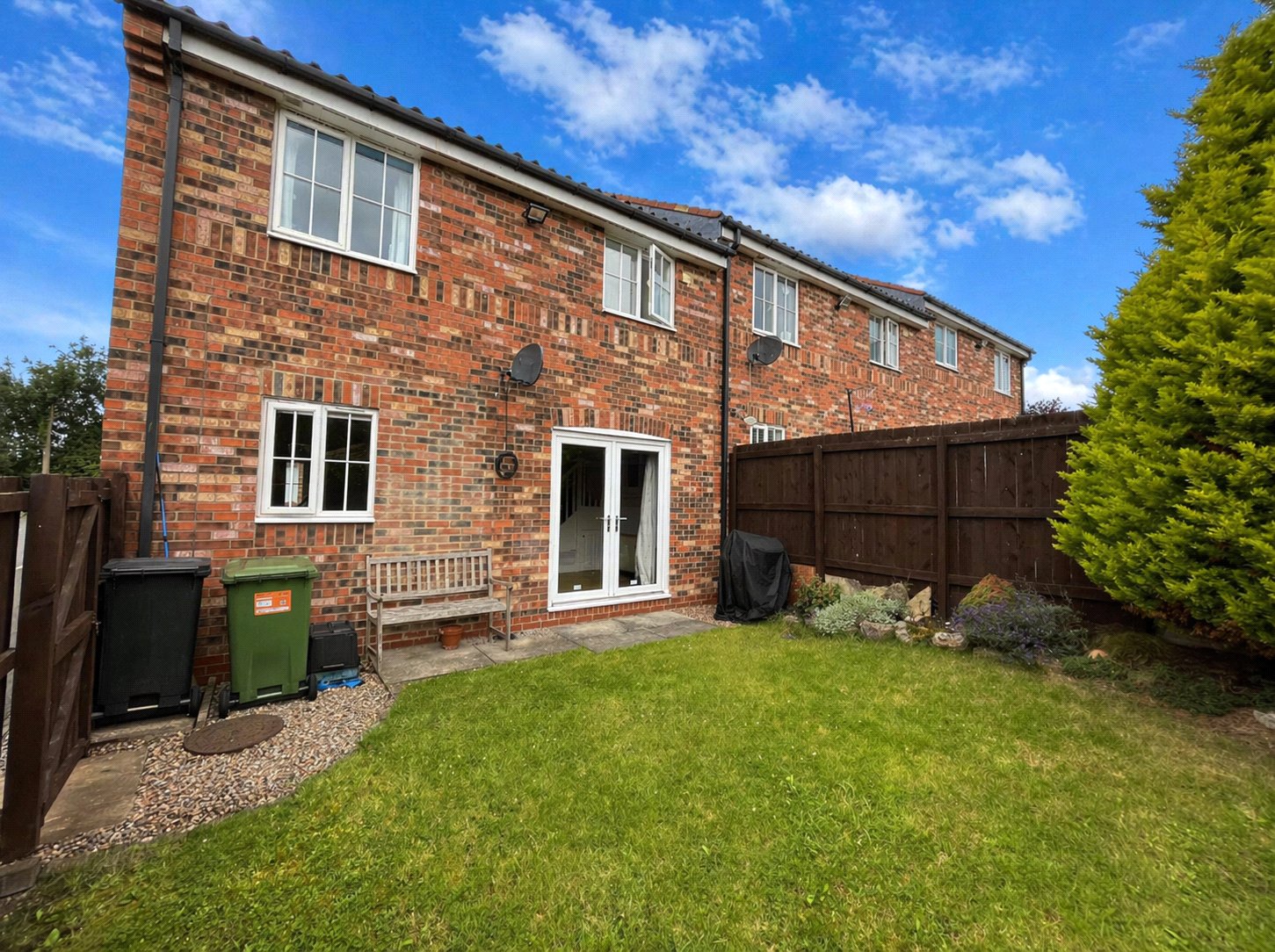 Private rear garden, paved and lawned with mature borders with side gate access.