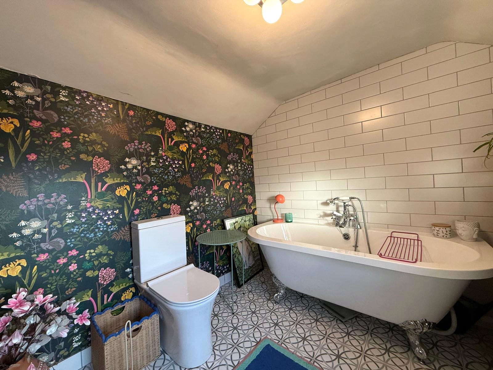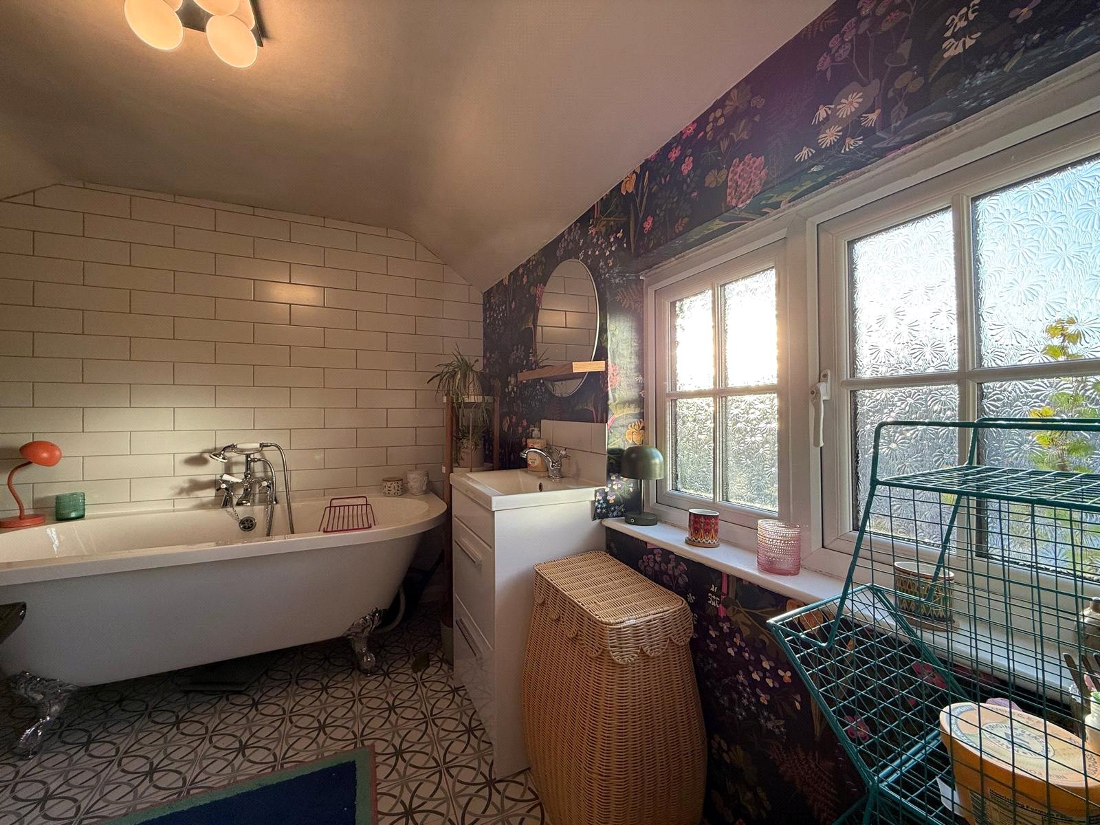Tiled flooring, radiator, W/C, basin, double glazed window, standalone bath, part tiles walls.