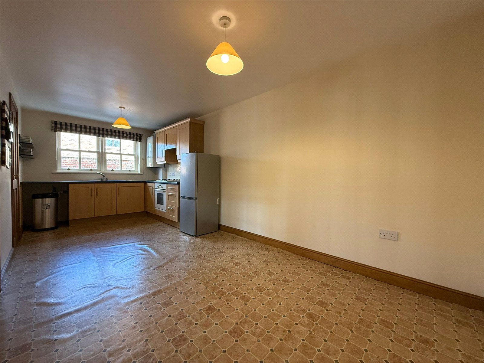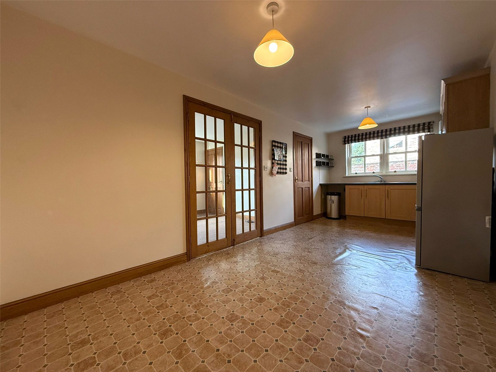 Lino, double glazed sash window, sink, oven, hob, extractor fan, tiled walls & splashbacks, cupboard space and worktops, boiler, radiator, access to understairs storage, double doors to living room.