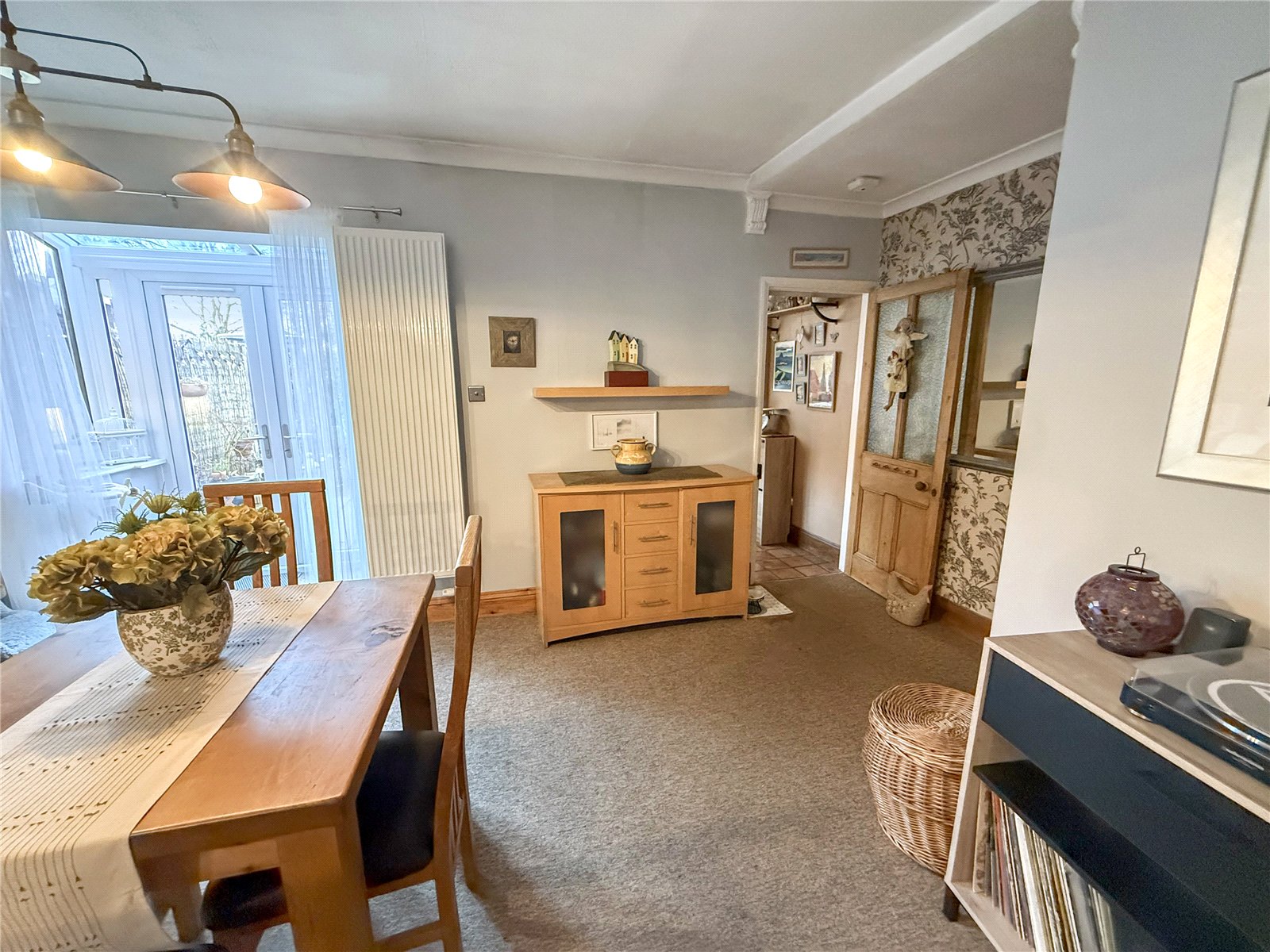 Double-glazed windows, feature fireplace with inset log burner. tall radiator, understair cupboard, archway through to rear porch/small conservatory,carpet.