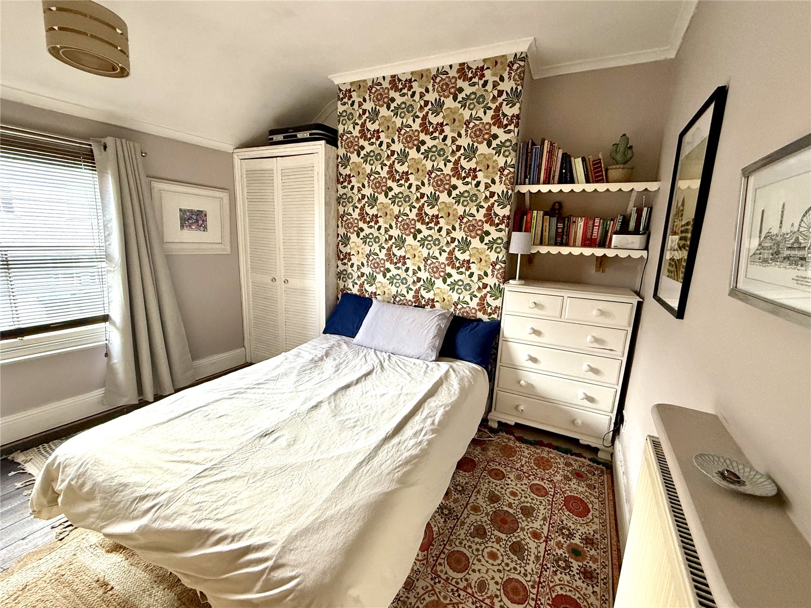 Original sliding sash timber framed window, Radiator, boiler cupboard, double built-in louvre door robes, carpet