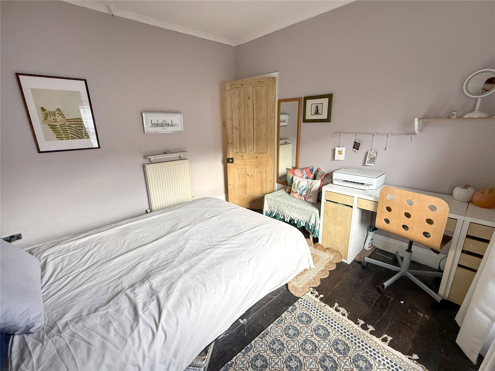 Orginal sliding sash timber framed window, radiator,carpet.