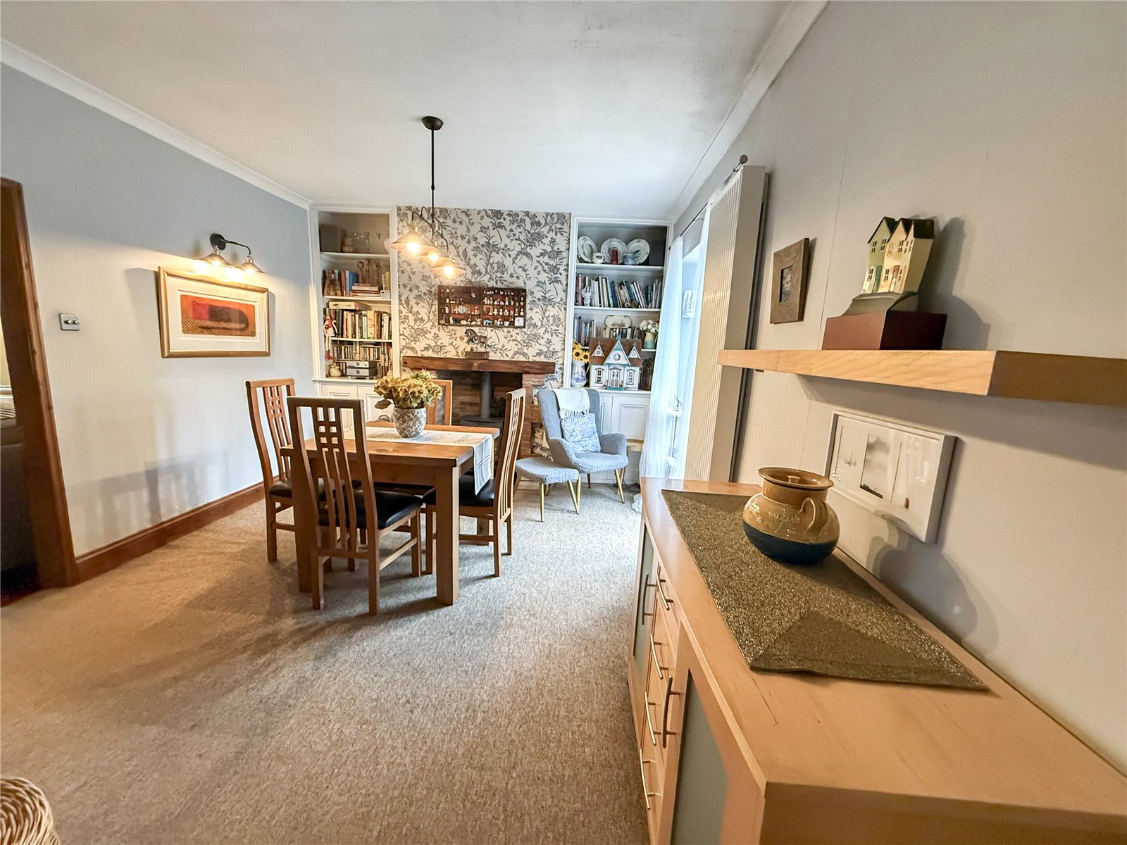 Arranged over two floors, the accommodation offers a warm and practical layout throughout. The ground floor begins with a welcoming entrance hall leading into a spacious living room, enhanced by plenty of natural light. There is also a fully fitted kitchen, along with a separate dining area providing ample storage and worktop space, featuring a log burner as a focal point. The dining area also offers access to the rear of the property, creating a natural flow between indoor and outdoor living.