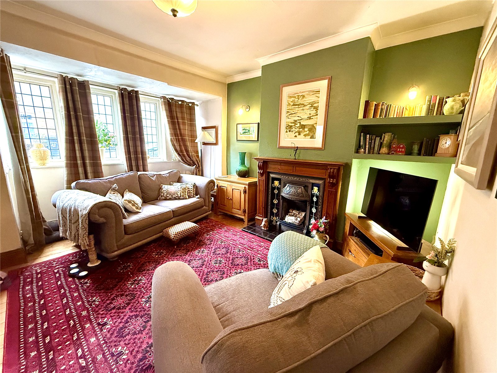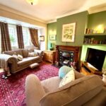 Large 4-part bay windows, feature fireplace with inset gas fire, timber mantel, ornate surround, solid timber flooring, carpet, radiator.