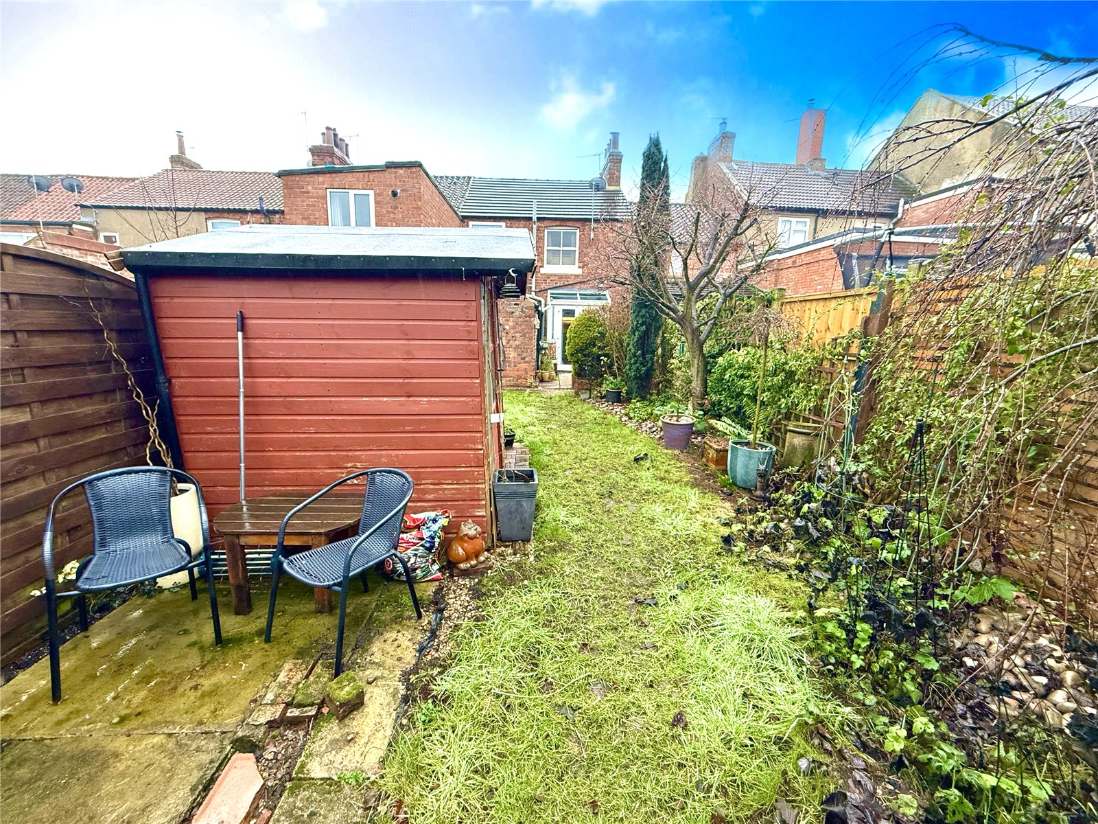 Stone-paved patio area, lawned, trees, shed, acess to private parking at rear.
