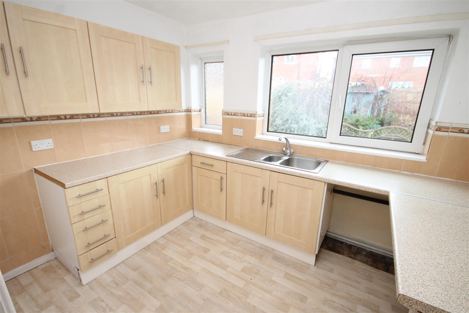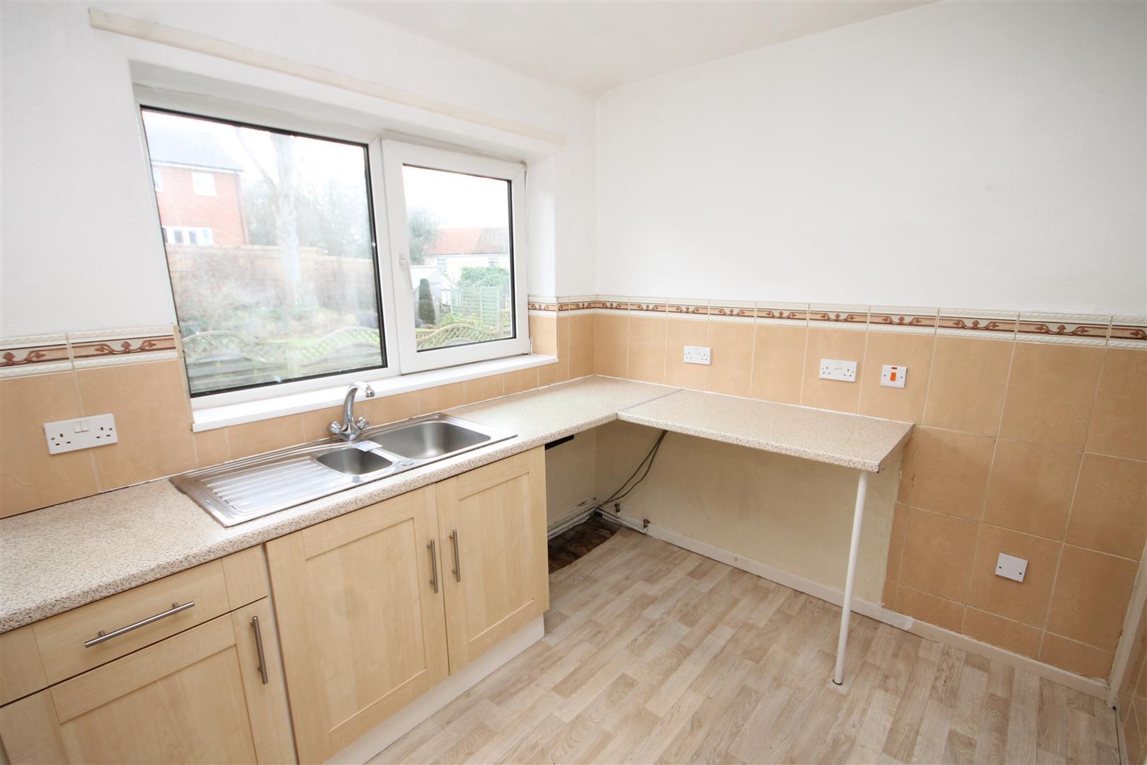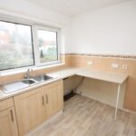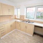 With 2x rear facing UPVC double glazed windows, a range of base, wall and drawer units, worktops inset with stainless steel sink and drainer, mixer tap, breakfast bar, tiled splashbacks, electric oven point, plumbed for washing machine, spotlights and radiator.