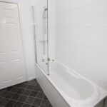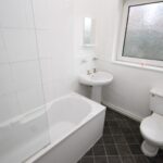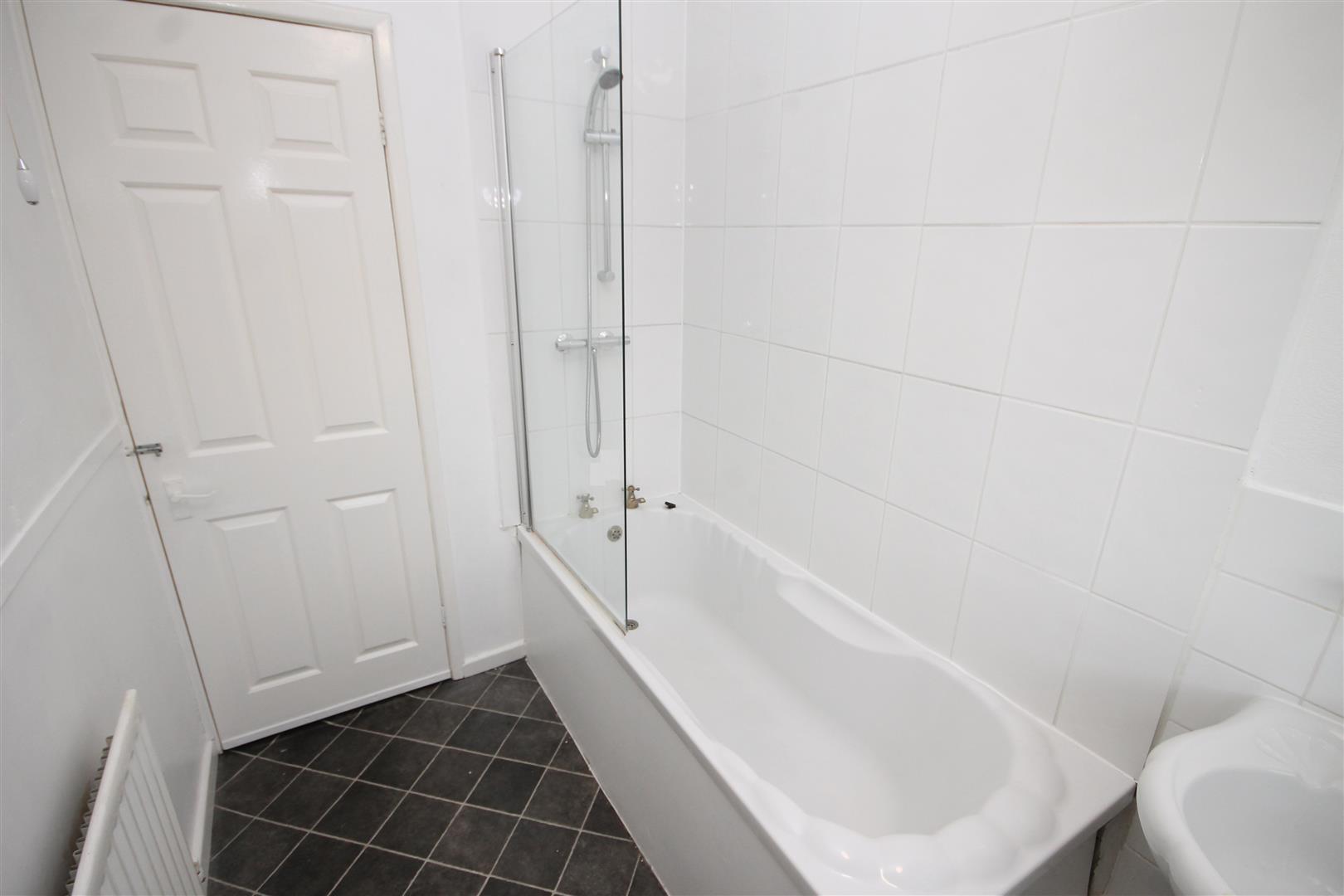 With rear facing UPVC double glazed window, panelled bath with shower and screen, low level WC, pedestal wash hand basin, part tiled walls and radiator.
