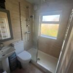 Double-glazed window, tiled walls and floor, mains powered walk-in shower, vanity unit, heated towel rail, hand basin and toilet.