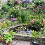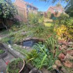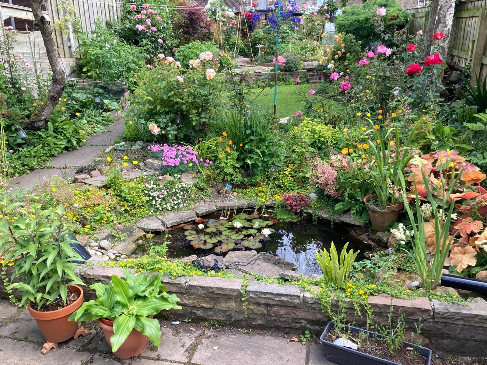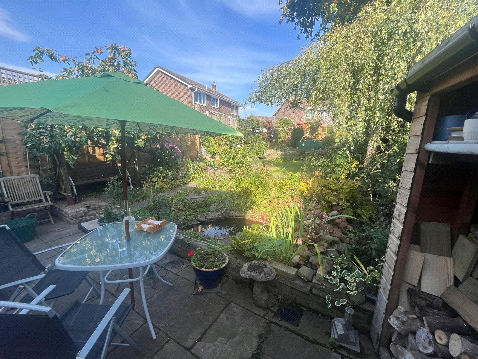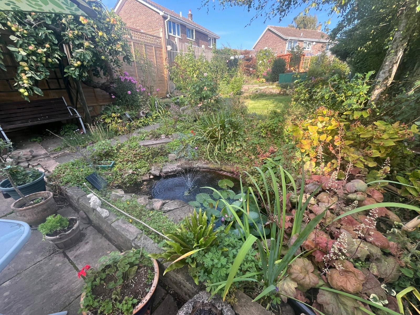 Rear garden, mature borders and lawn areas, patio area and pond at back door, steps up through the garden to summer house, with electric, and another patio area.