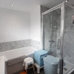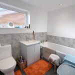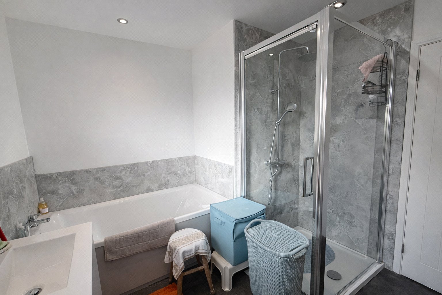 Double-Glazed window, Modern Family bathroom suite, panelled bath with mixer tap, separate glazed shower, contemporary wash hand basin set within vanity storage unit, low level w/c., Recessed ceiling spotlighting, tile effect flooring, radiator.