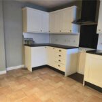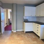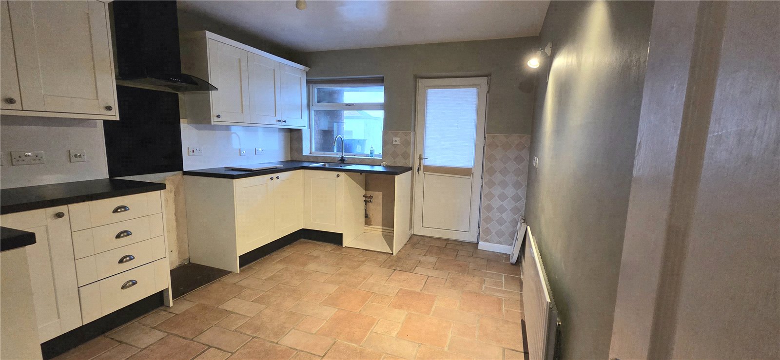Double-glazed window, door to rear, full range of base and wall units, tiled floor, space for free-standing cooker, fridge/freezer and washing machine, radiator.