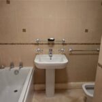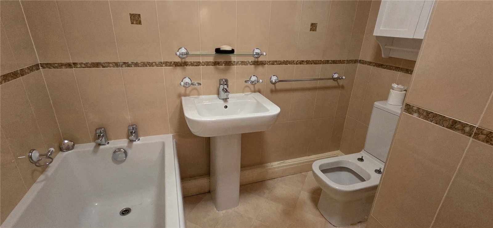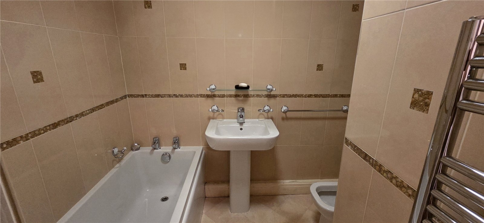 3-piece suit of panelled bath, w/c, hand basin. Tiled walls, vinyl flooring, chrome towel warmer.