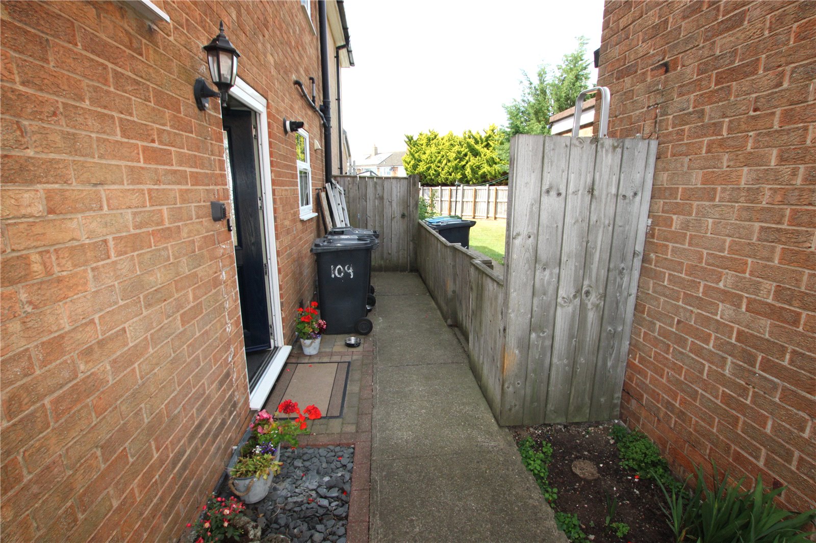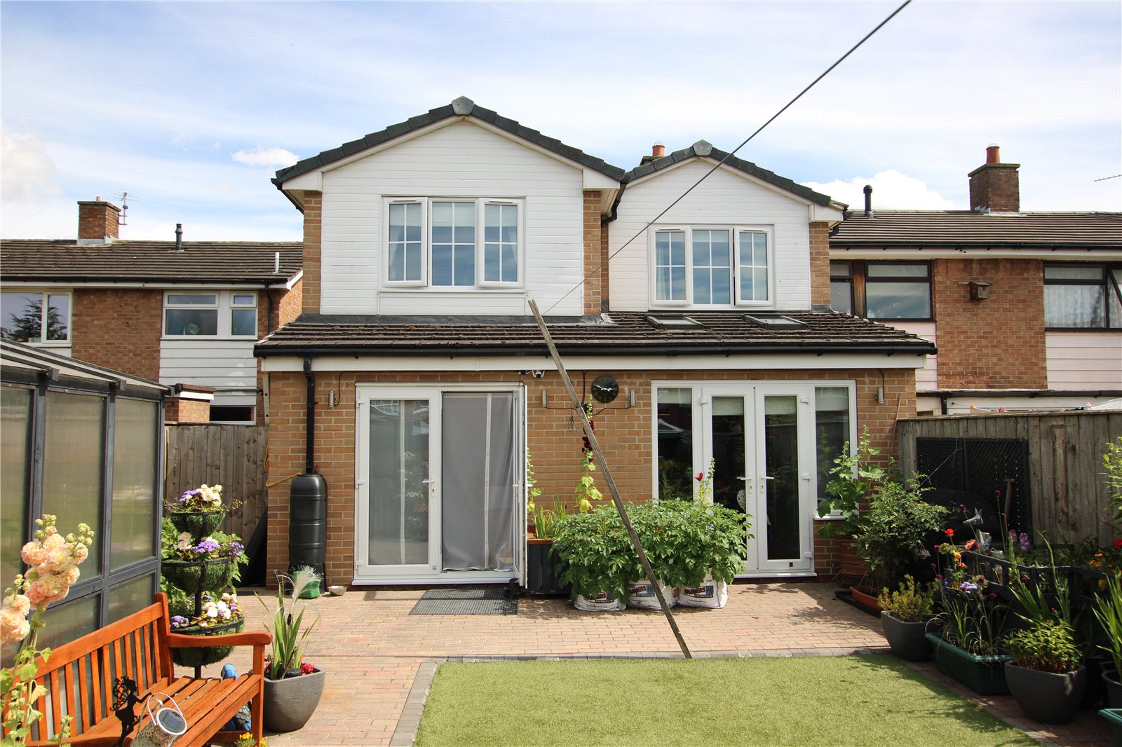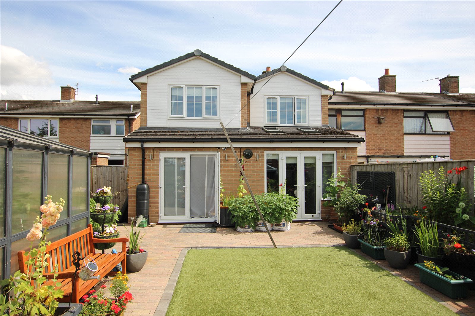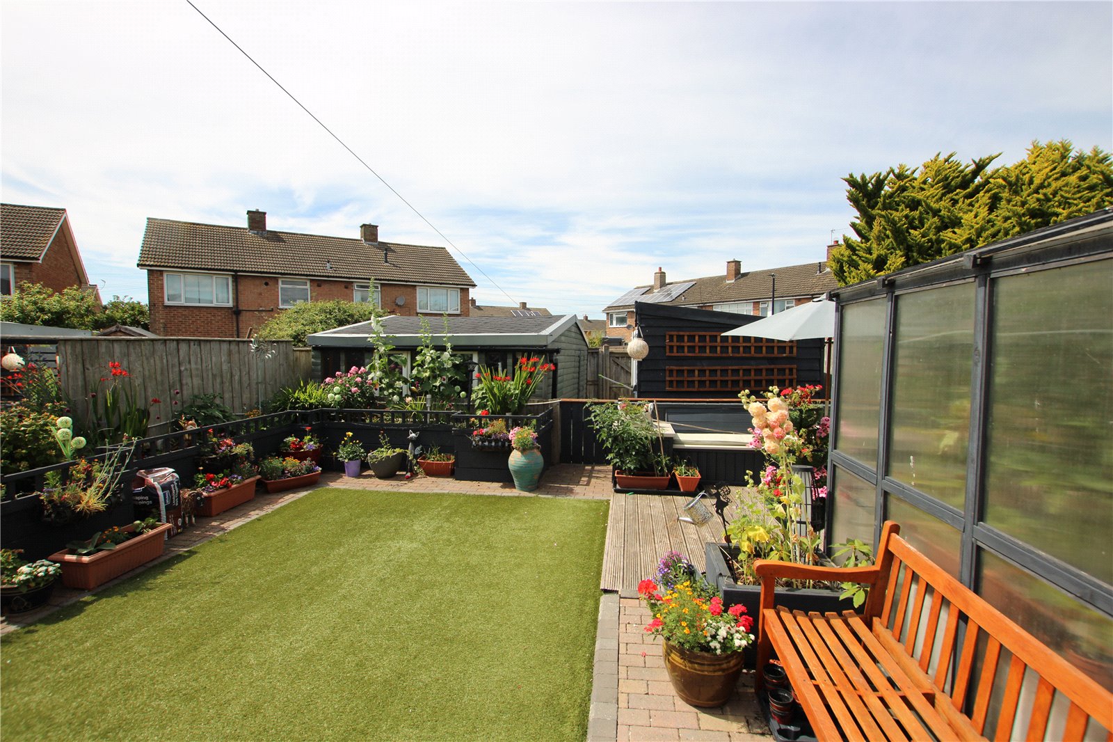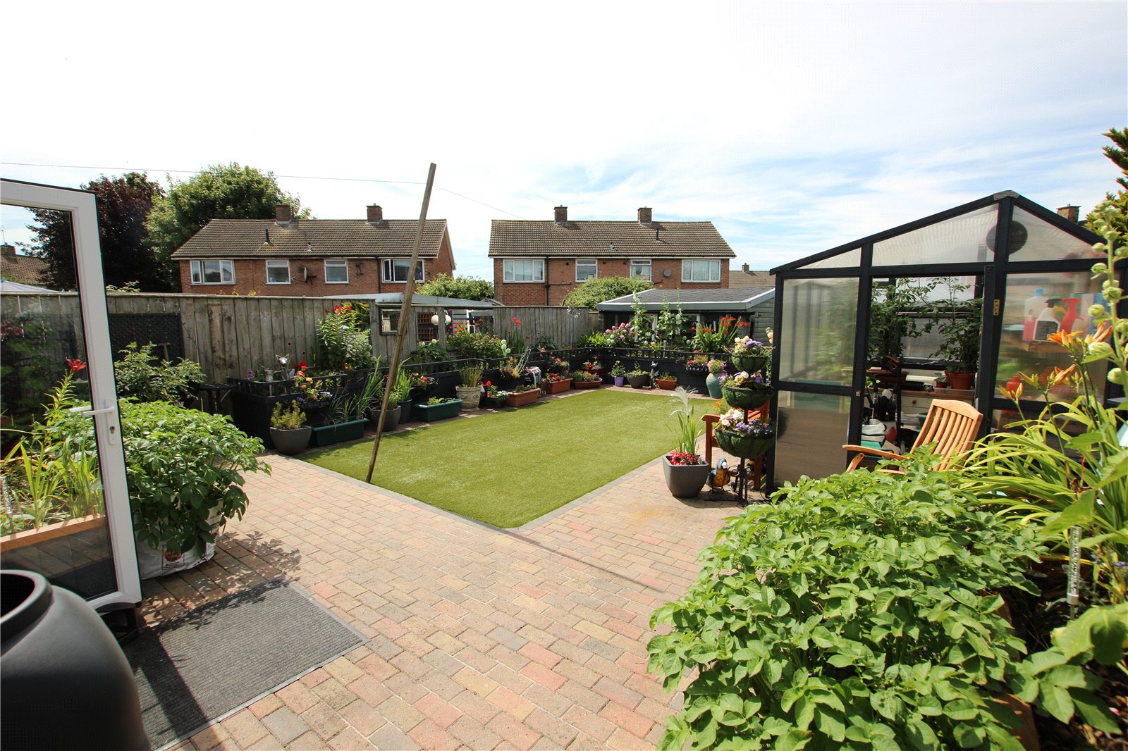 Seperated into 2 areas, artificial turf lawned and Block paved and fenced off area housing 2 large sheds, area could be used as parking as it has double gates at rear.
