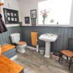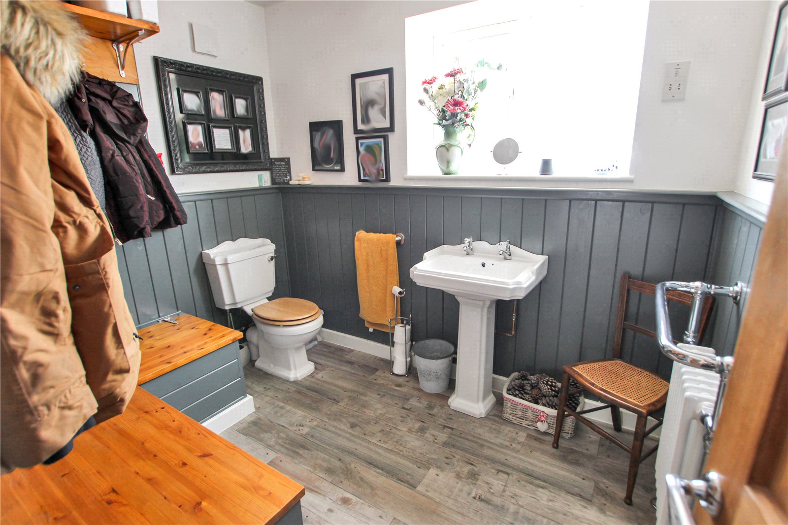 Double glazed window, Built-in boot storage cupboards, Half height panelled walls, WC, Hand basin, Radiator/ Towel warmer and tiled floor.