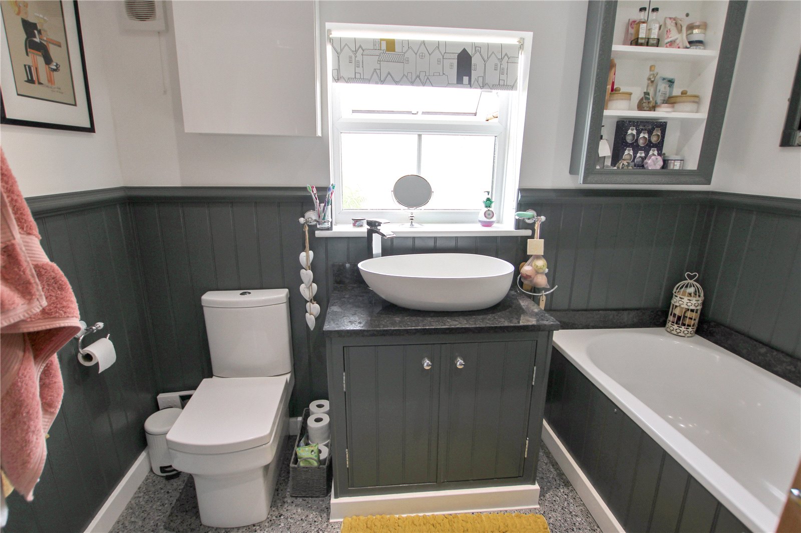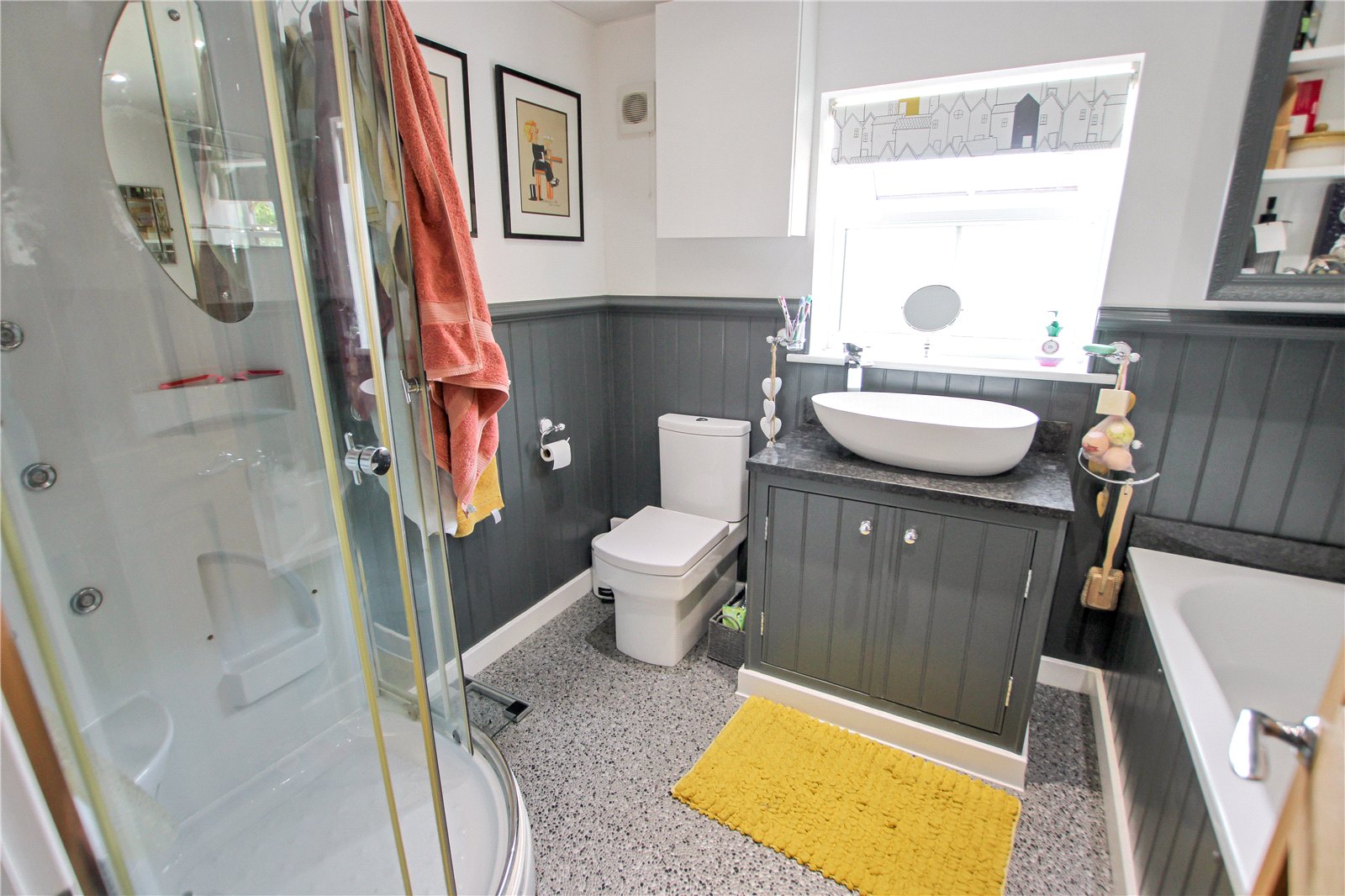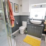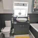 Double glazed window, Bath, WC, Hand basin, Shower cubicle with Bar shower, Half height panelled walls, Vinyl flooring.