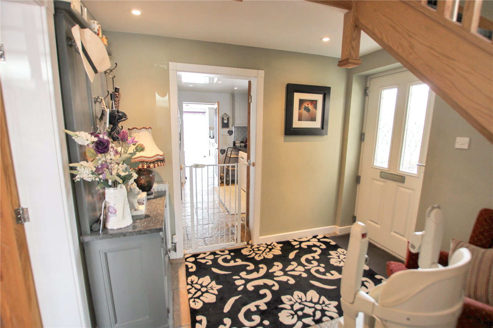 Double glazed entrance door, Tiled floor, Under stair storage cupboard, Leading to staircase.