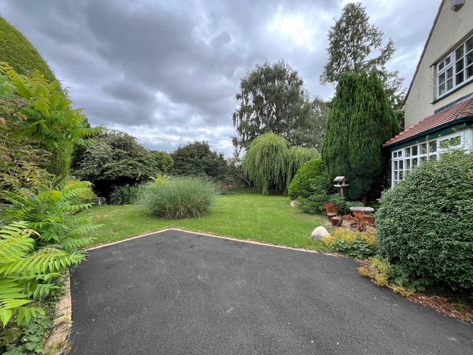 New Tarmac Driveway leading to Double garage. Lawned and Mature borders to all sides, Over 1/4 acre in total, Fruit trees.