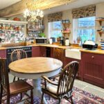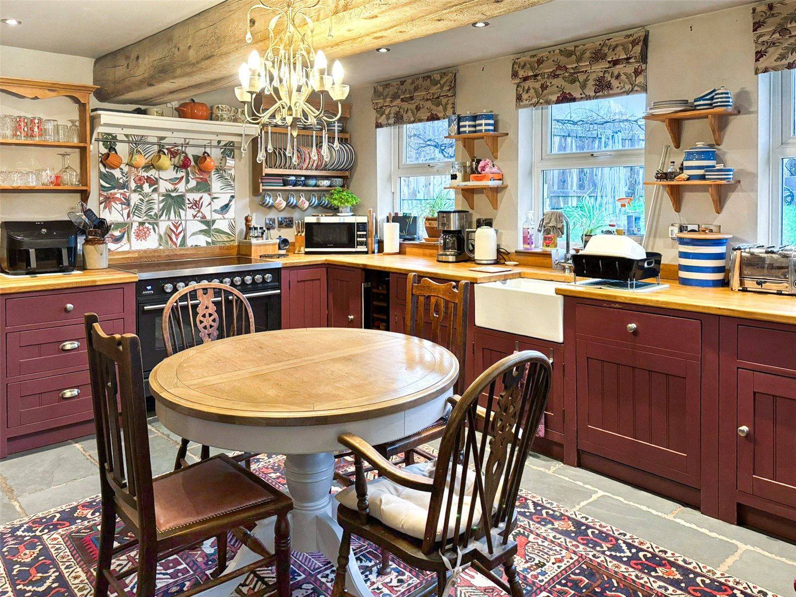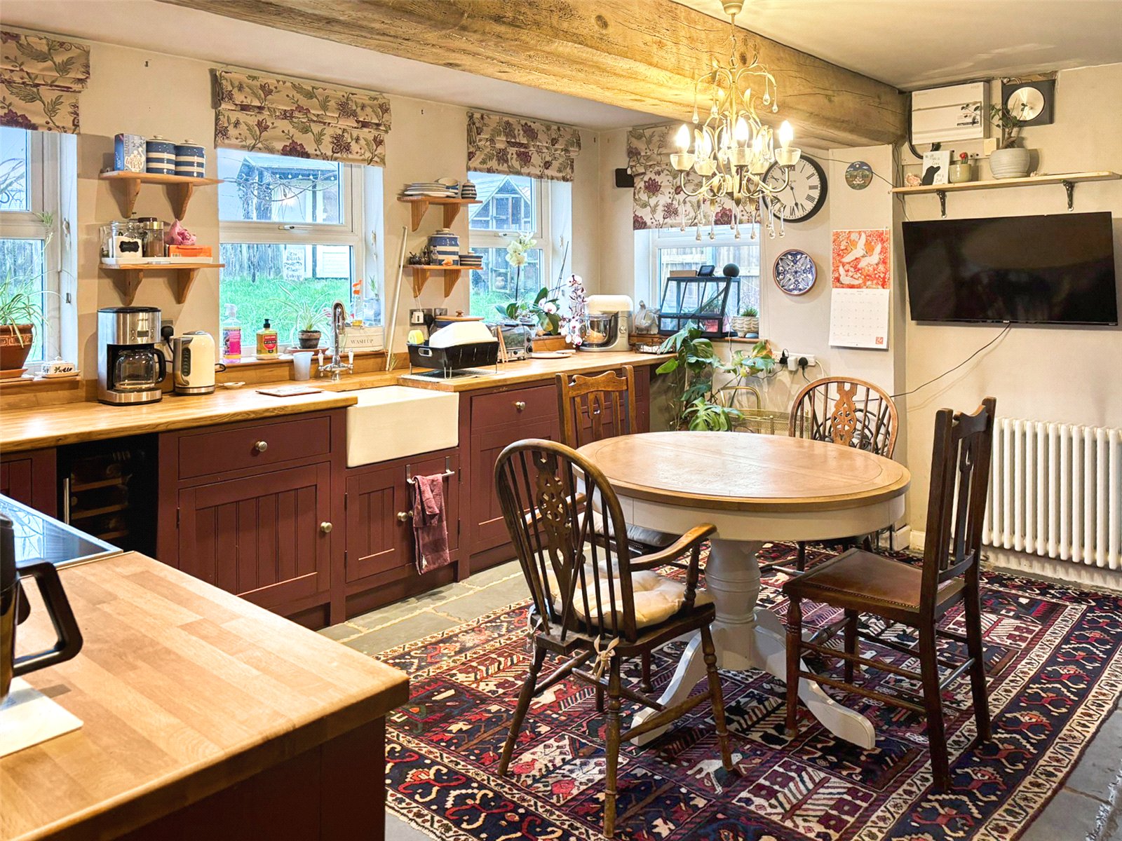 With double glazing to the rear, this spacious open-plan kitchen features a modern fitted range of base units, a ceramic fireclay double sink unit, modular counters, and space for a range with a stainless steel extractor. It includes a wine rack, space and plumbing for a dishwasher, a radiator, and three double-glazed windows overlooking the garden, with an additional double-glazed window and door to the side porch. An oak door leads to the lounge, while a large pantry adds abundant storage.