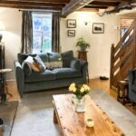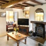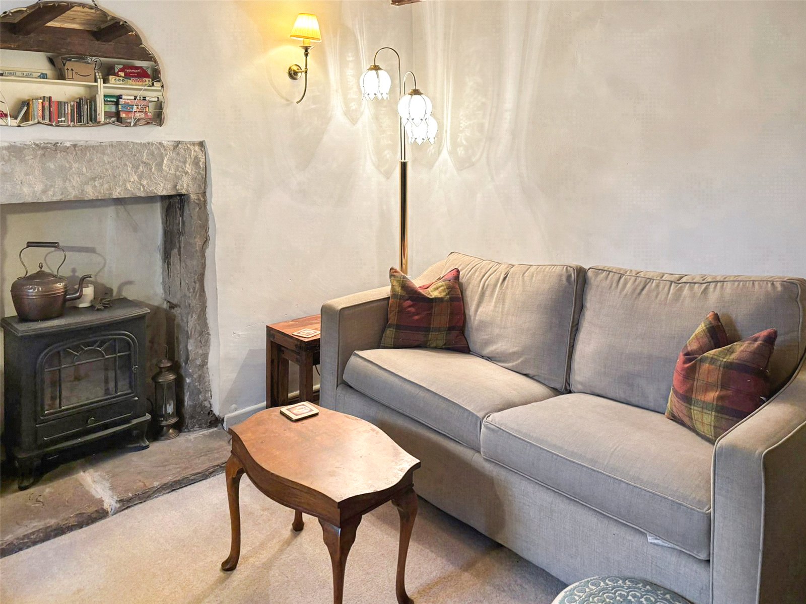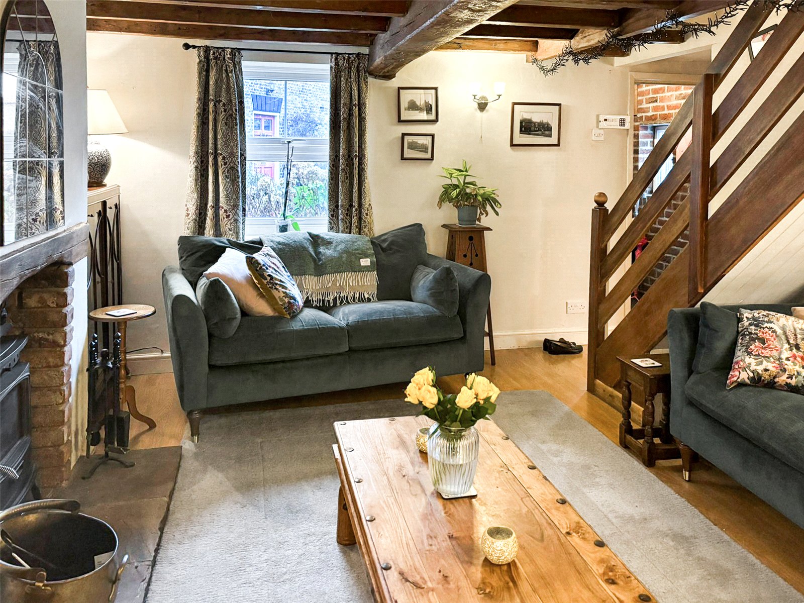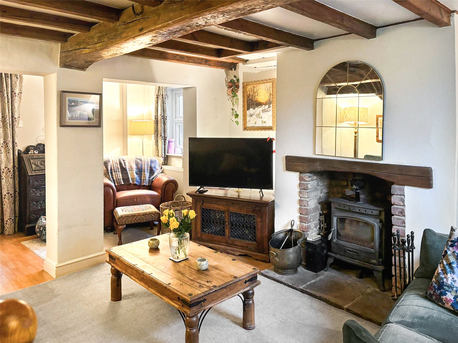 With double glazed window to the front and side, television point, beamed ceiling, recessed multi-fuel stove with oak mantle, engineered wood flooring, staircase to the first floor and radiator.