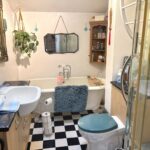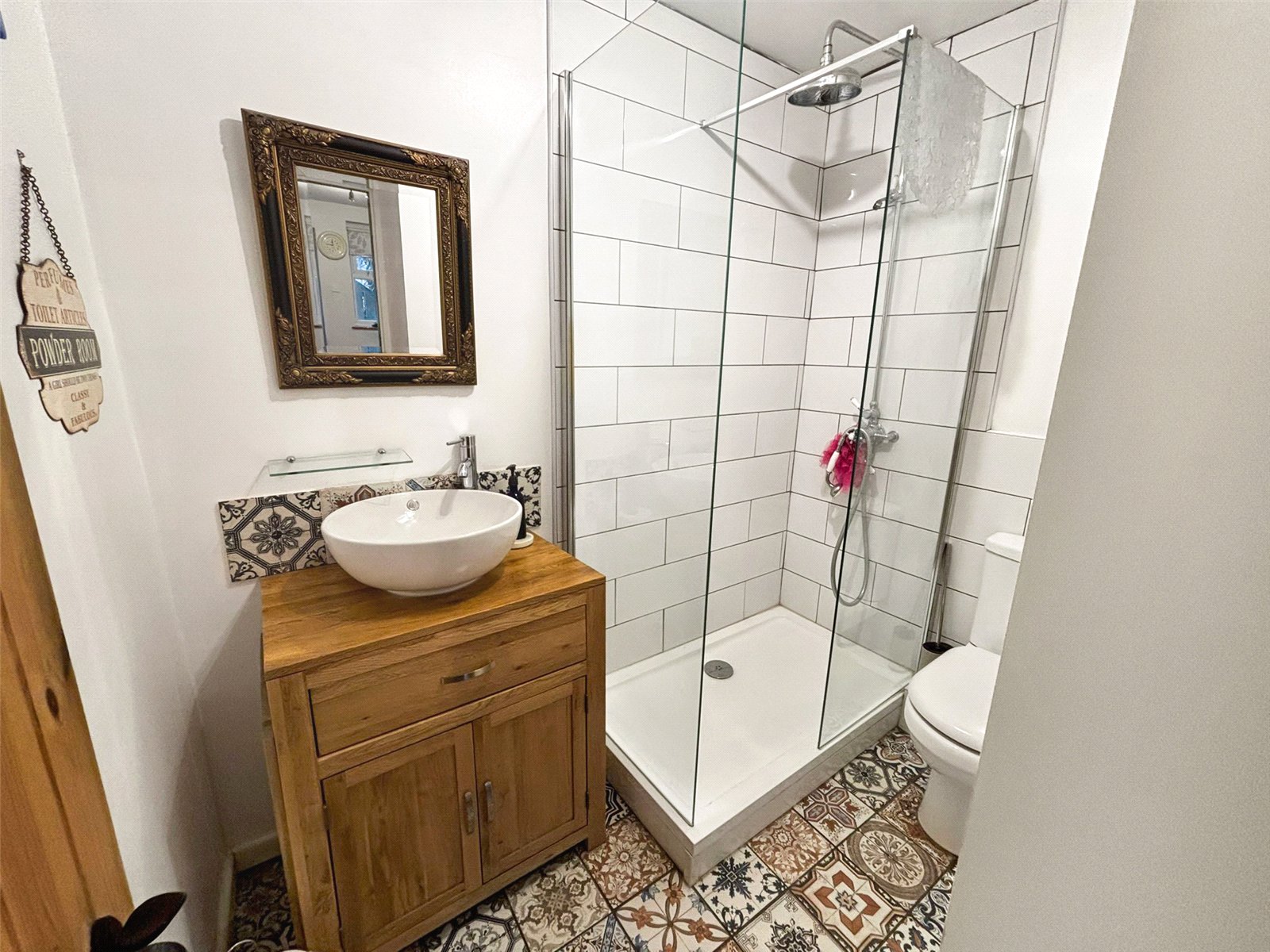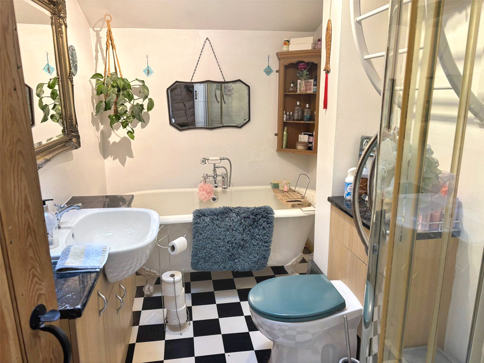 Including a four piece suite comprising of a rolled top free standing bath, step in shower cubicle, hand basin with vanity unit, hidden cistern w.c., spotlights, vertical heated towel rail and velux window.