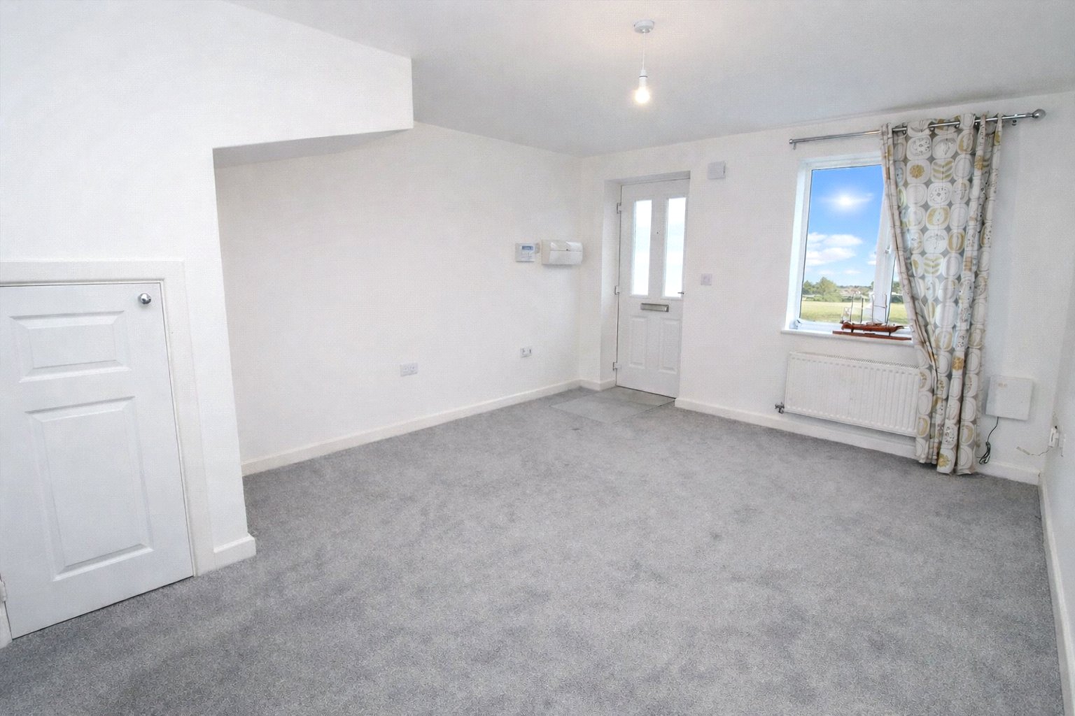 Double-glazed window, under-stairs storage cupboard, carpet and radiator.