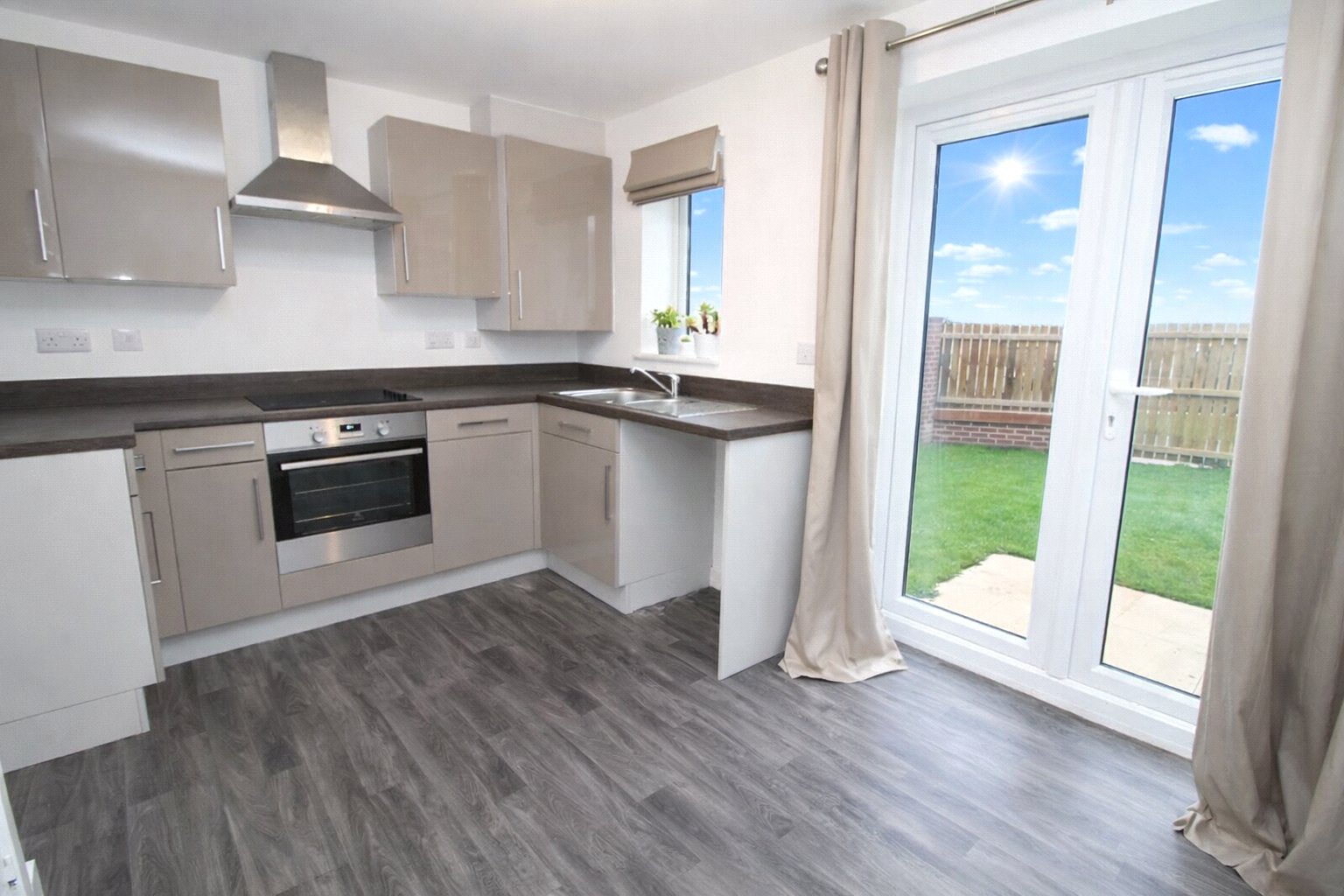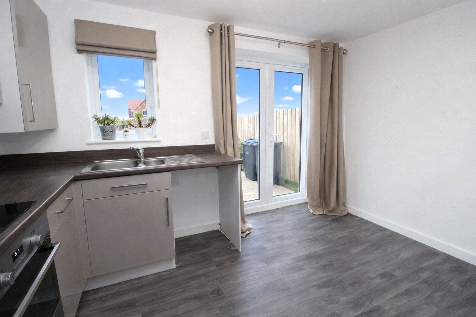 Double-glazed window, laminate flooring, gas boiler, full range of wall and base units, and radiator. Patio doors out to the rear garden. Space for dishwasher, washing machine and fridge/freezer.