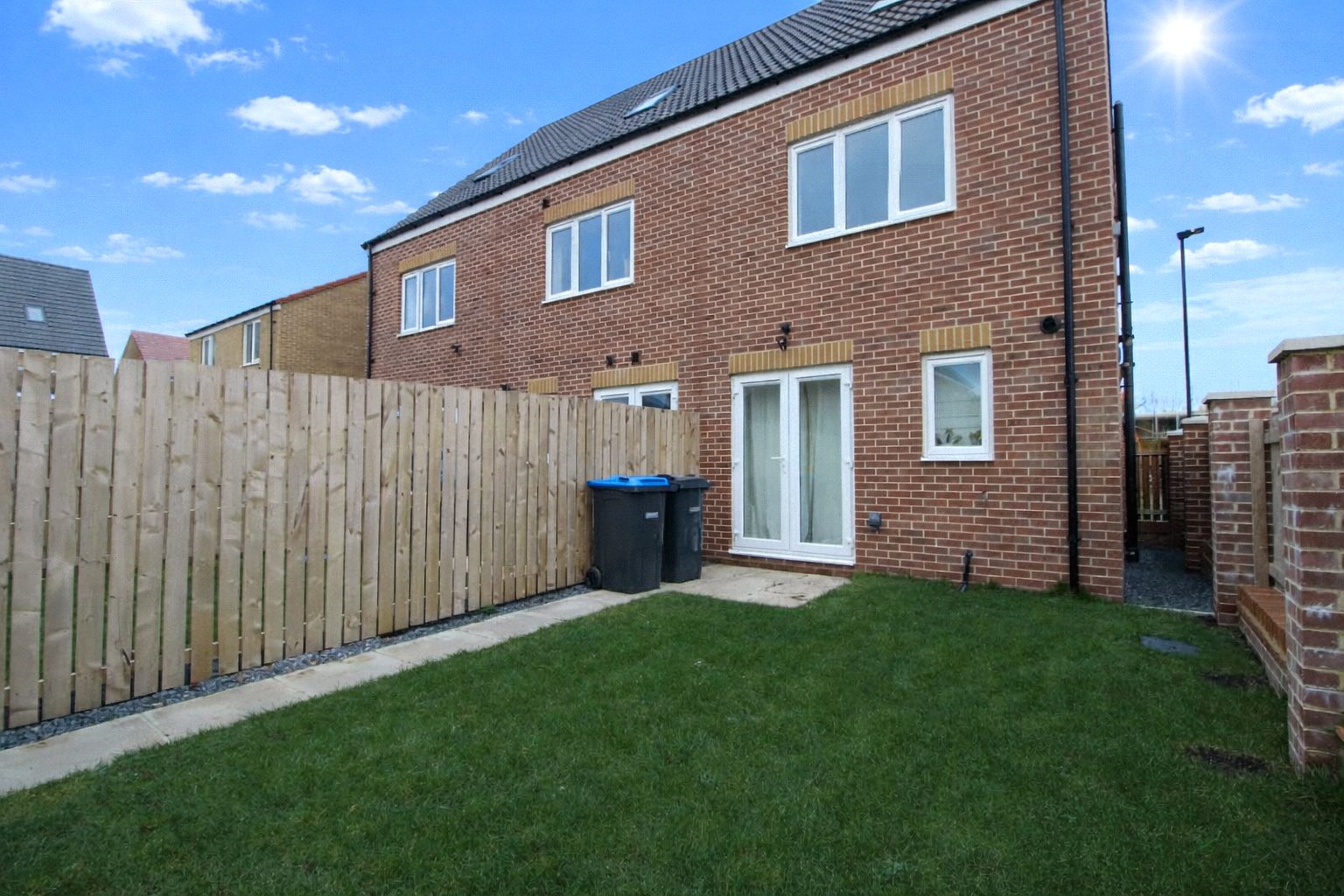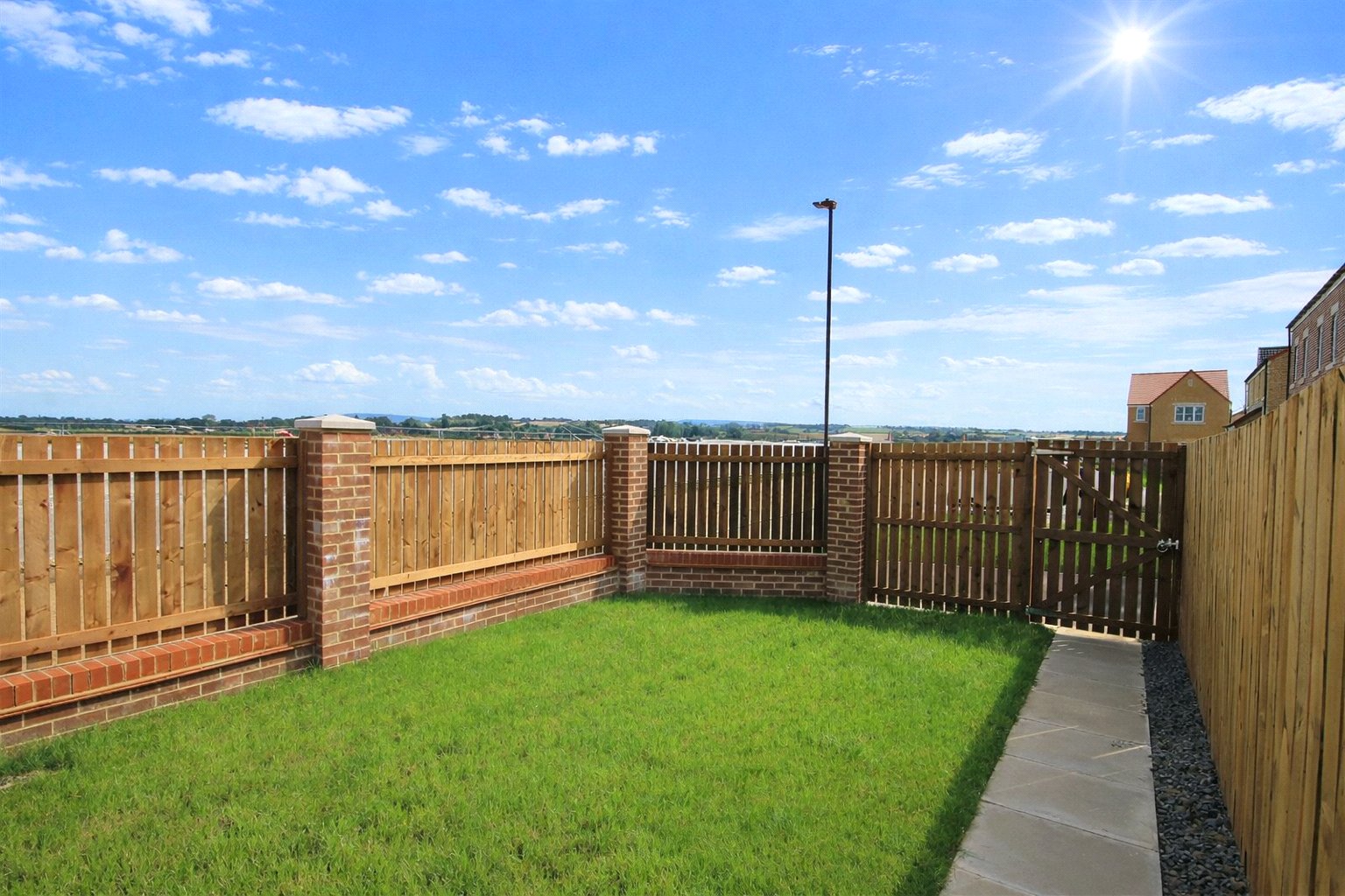 Laid to lawn, with foot path from patio doors to rear gate, and side access to front of the house.
