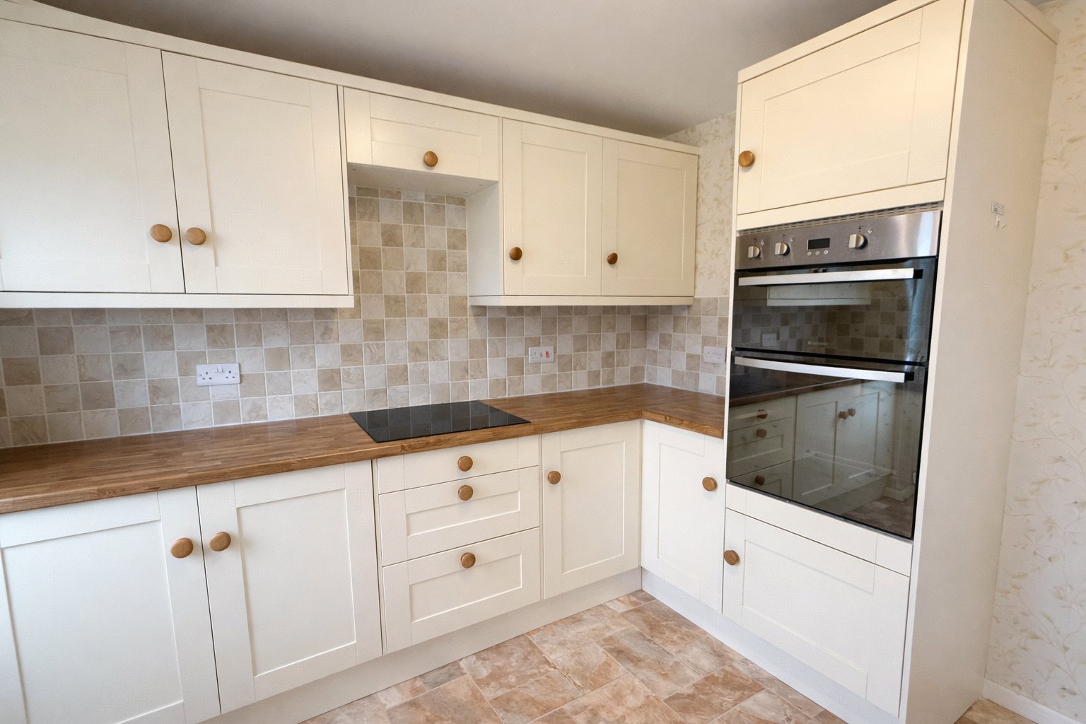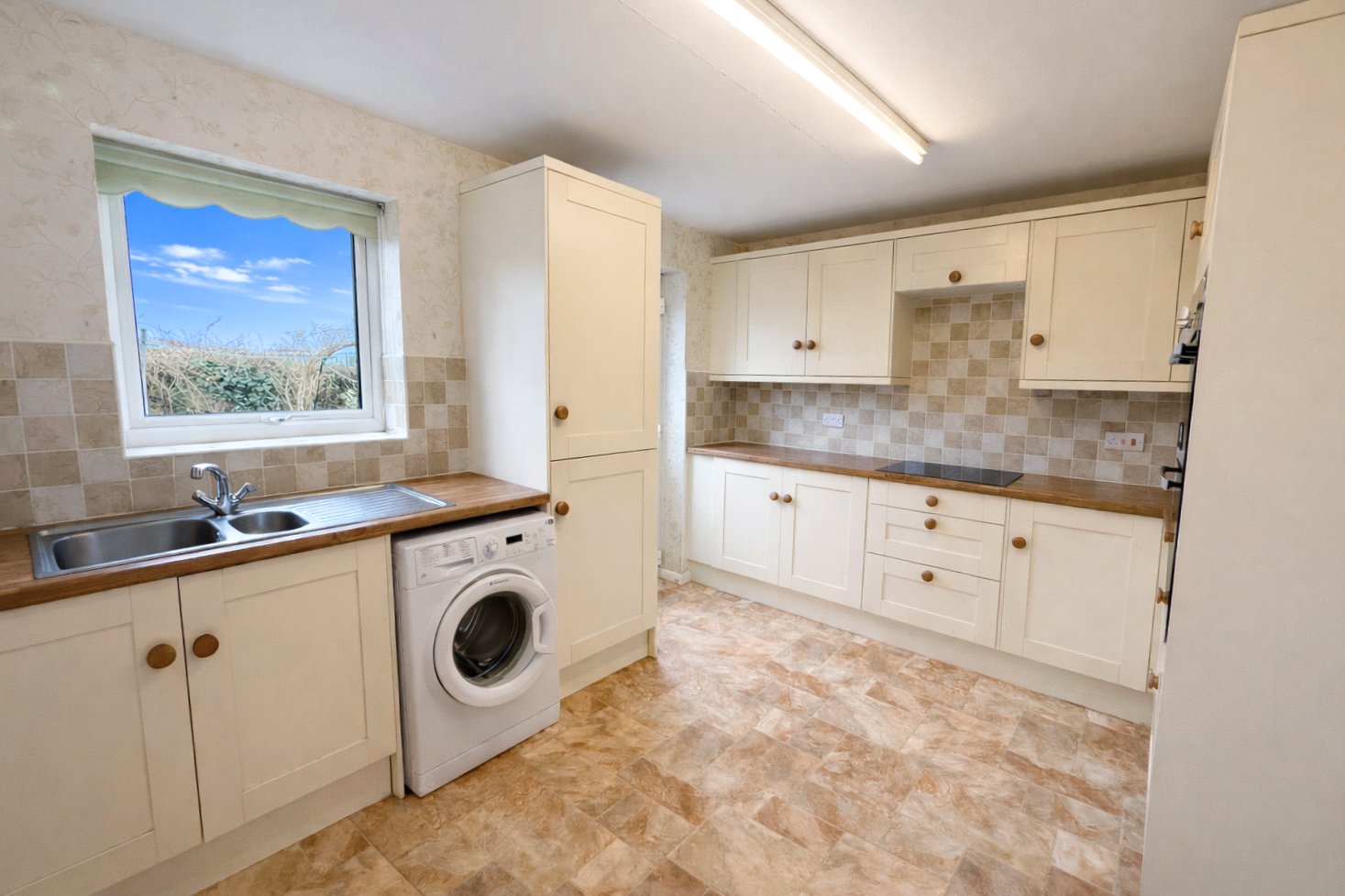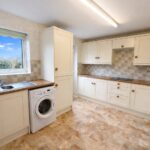 Pantry, lino, double glazed windows, back door, electric radiator, cupboards, worktops, tiled walls, fitted sink, hob, oven, freestanding washing machine & space for fridge freezer.