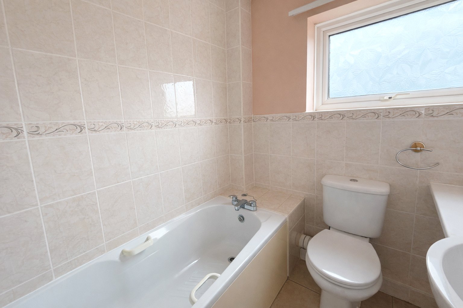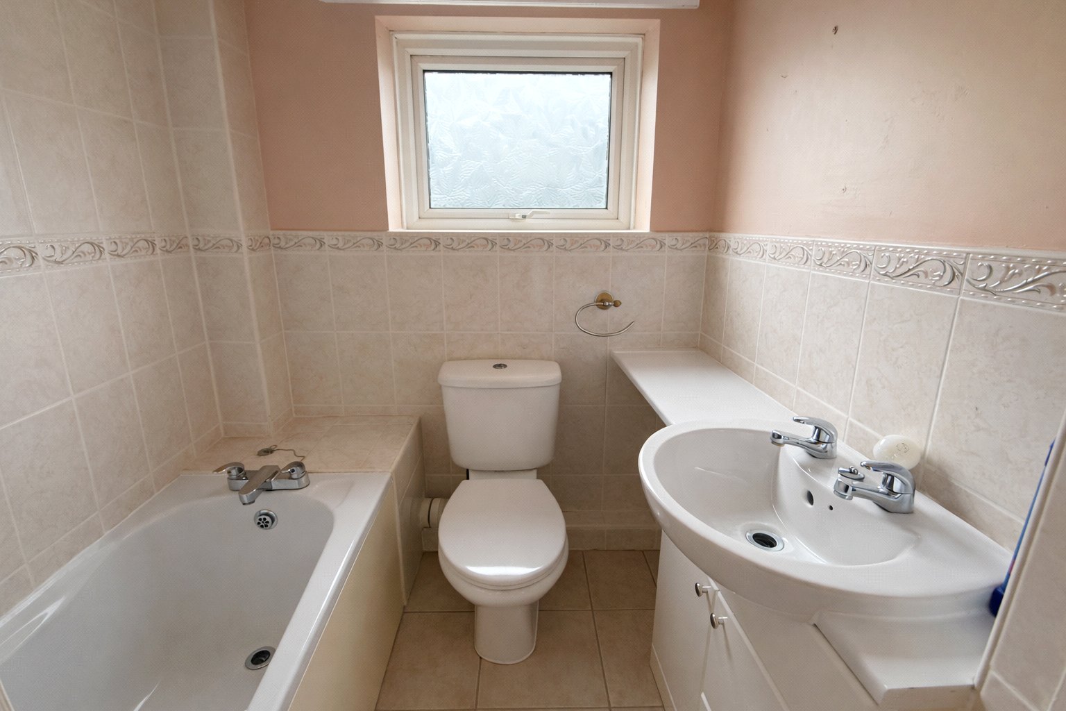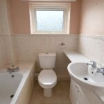 Tiled flooring, tiled walls, double glazed window, bathtub with shower, W/C, basin, airing cupboard hosting hot tank.