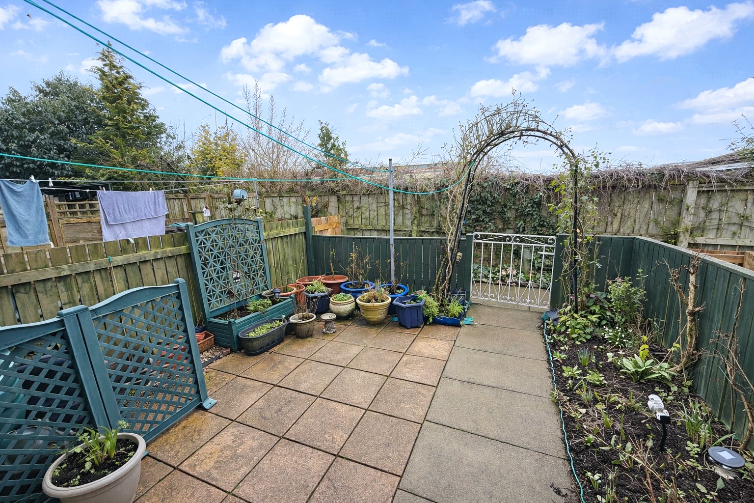 Patio, plants, alleyway to garage.